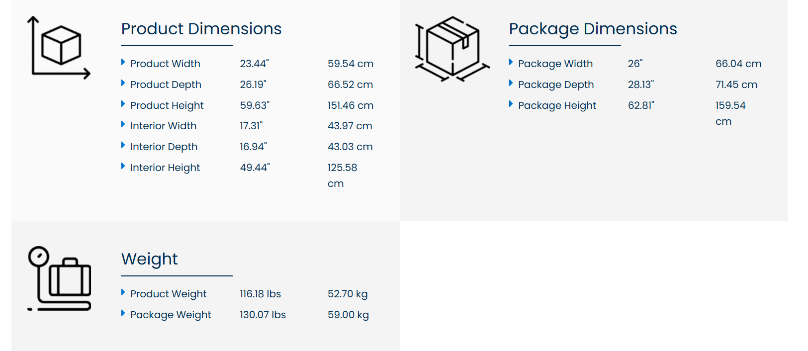 – Dimensions: 23.82″ W x 26.97″ D x 59.8″ H