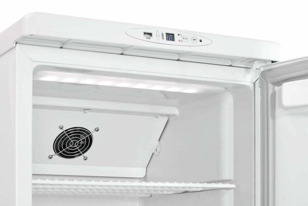 A digital thermostat allows for easy monitoring and adjustment of the internal temperature. This medical refrigerator is equipped with a reversible door hinge, offering flexibility in installation to accommodate various medical settings. An integrated door lock enhances security for sensitive medical supplies.